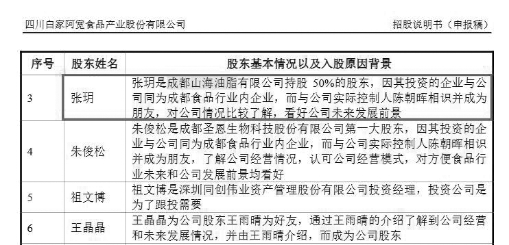 需要指出的是,成都山海油脂有限公司并列第一大股東張玥為阿寬食品股東,持有0.5218%股份。據(jù)招股書,張玥是成都山海油脂有限公司持股50%的股東,因其投資的企業(yè)與公司同為成都食品行業(yè)內(nèi)企業(yè),而與公司實(shí)際控制人陳朝暉相識(shí)并成為朋友,對(duì)公司情況比較了解,看好公司未來(lái)發(fā)展前景(見(jiàn)圖三)。