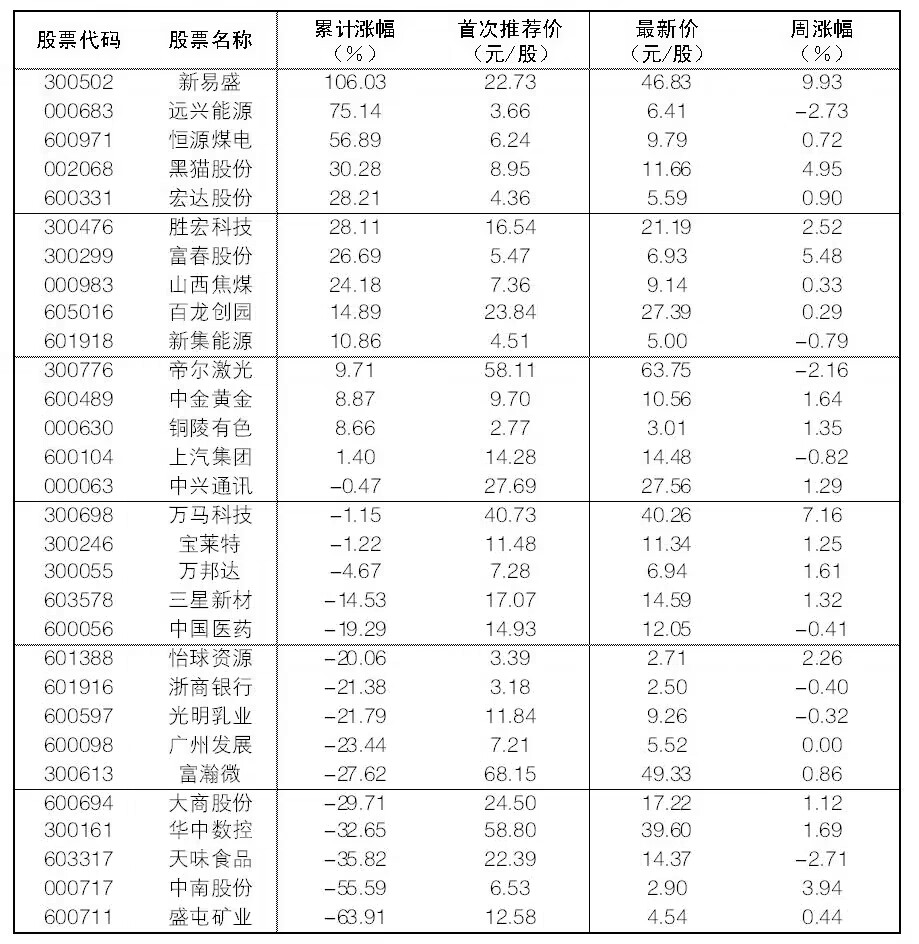 30成份股本周漲幅前五位的是新易盛、富春股份、黑貓股份、中南股份、勝宏科技,漲幅分別為9.93%、5.48%、4.95%、3.94%、2.52%;跌幅方面,遠興能源、天味食品、帝爾激光、上汽集團跌幅居前。