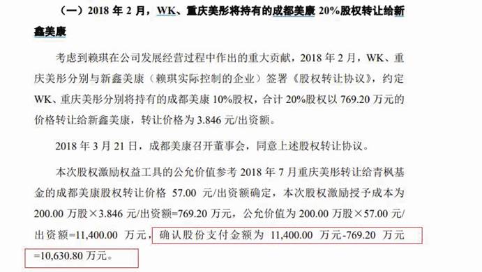 2018年3月,WK通過重慶美彤受讓55%成都美康的股權后,已成為公司控股股東的控股股東,不過當時賴琪還未完全擺脫和邱宇的代持關系,仍通過重慶美彤代邱宇持有公司部分股權,這時WK竟然回過頭來,又和重慶美彤聯合對賴琪進行超億元的股權激勵,而激勵的形式又是通過超低價售賣成都美康的股權。