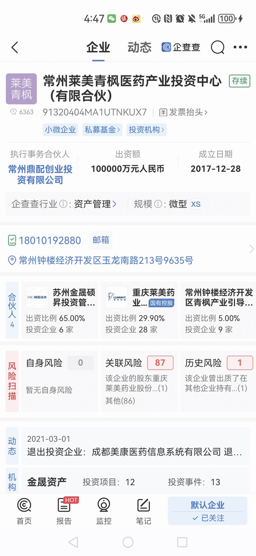 更復雜的是,2011年,通過轉讓股權給王志霆,賴琪解除其與邱宇的部分代持關系,王志霆又通過重新轉回該部分股權給賴琪所控制的新鑫美康,解除其與WK的代持關系(見圖四)。而受讓重慶美彤(賴琪代邱宇持有)持有公司部分股權的青楓基金,僅兩年后就又將該部分受讓股權重新轉回給賴琪。通過企查查查詢的工商信息顯示,青楓基金持股29.9%的第二大股東為萊美藥業,萊美藥業又系邱宇曾經控制的企業(見圖五)。