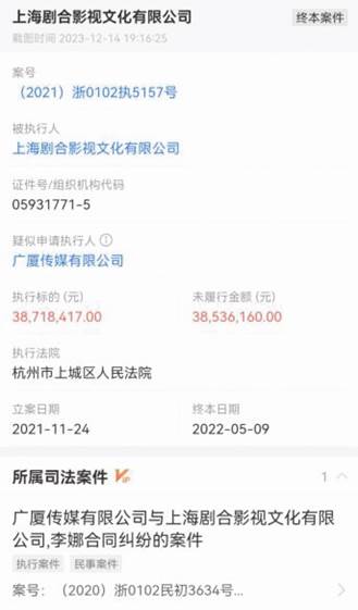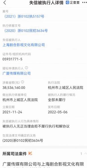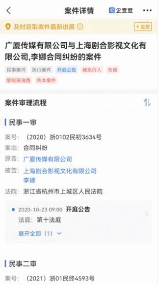 圖一:企查查關于廣廈傳媒與上海劇合案件截圖