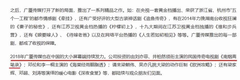此外,有關于廣廈傳媒的報道顯示其投資了《南煙齋筆錄》(見圖四)。同時,浙江廣廈集團旗下地產項目廣廈綠園在2018年8月27日曾發文,稱“電視劇《南煙齋筆錄》是由廣廈集團旗下廣廈傳媒參與出品的又一IP現象級影視力作,預計2018年底或2019年將于熒屏與觀眾見面。”