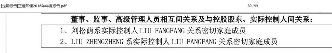 以2017年年報為例,正佳環保對于董監高相互關系及與控股股東、實控人間關系的表述為:“1、董事LIU ZHENGZHENG與董事長劉松蔭系關系密切家庭成員”“2、董事LIU ZHENGZHENG與高級管理人LIU FANGFANG系關系密切家庭成員”“3、 董事長劉松蔭與高級管理人LIU FANGFANG系關系密切家庭成員”。