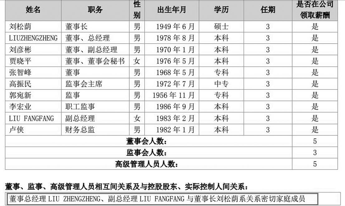 招股書對三名實控人簡歷披露如下:“劉松蔭:男,1949年出生,中國國籍,身份證號4129261949********,無境外永久居留權,碩士學歷。劉松蔭先生的主要創業經歷如下:1993年創建鄭州正力自控電氣廠,主營電氣設備。1995年,創建鄭州正力實業有限公司,主營電氣設備。1998年鄭州正力實業有限公司主營業務轉為聚丙烯酰胺類產品。”