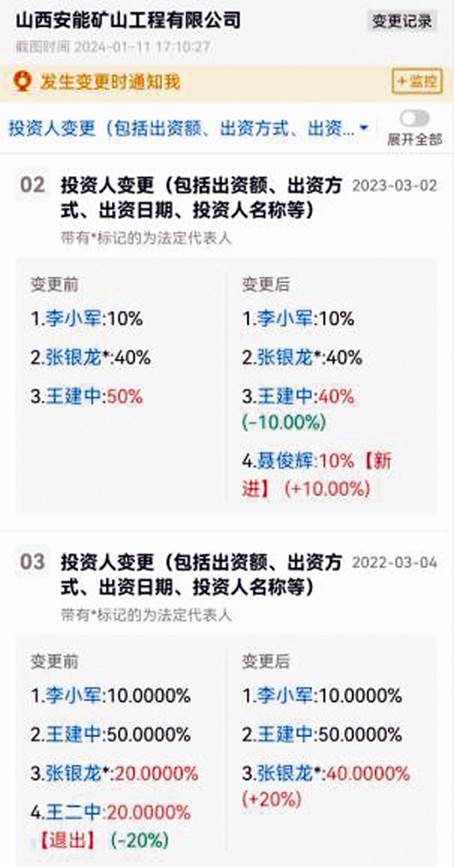 企查查查詢的安能礦山工商登記信息顯示,2022年3月4日,王建中持股50%不變,王二中向張銀龍轉讓20%股權后退出,張銀龍持股20%增至40%并成為法定代表人;2023年3月2日,該企業增資同時,王建中向聶俊輝轉讓10%股權,其余股東持股不變(見圖四)。