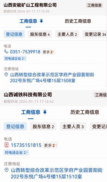 圖六:企查查關于安能礦山和山西誠鐵注冊地址截圖