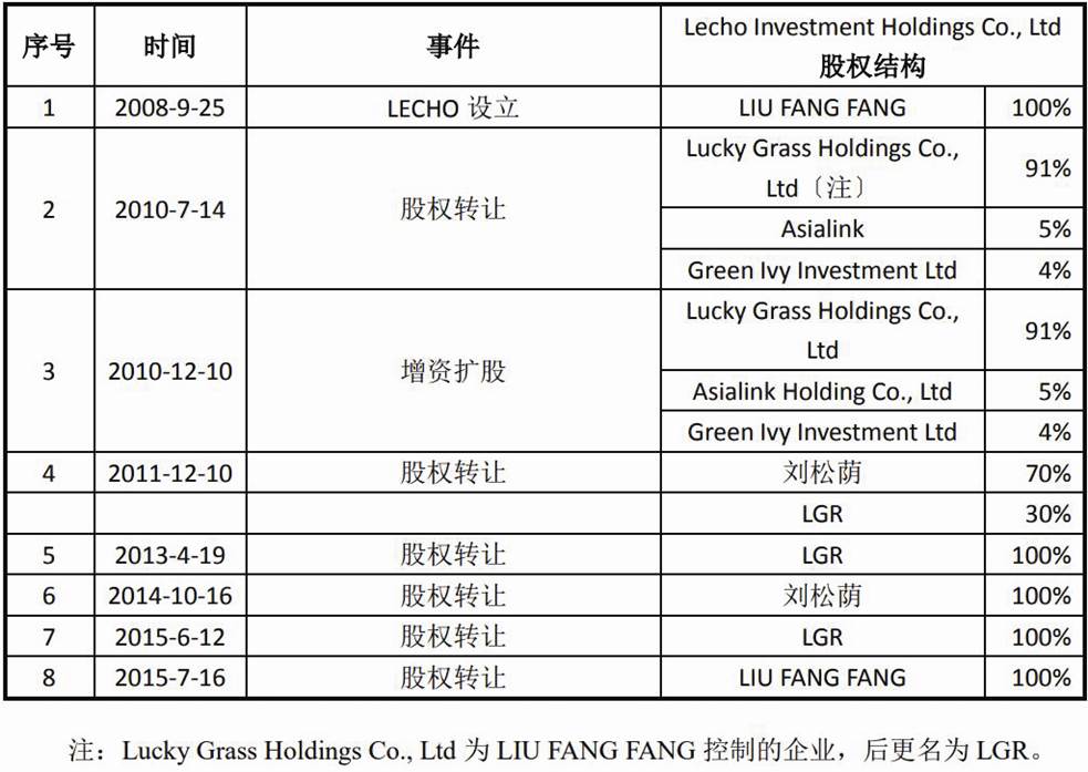 據(jù)Ogier律師事務(wù)所出具的法律意見,“2013年4月,因加拿大上市計劃終止,且前次股權(quán)轉(zhuǎn)讓時劉松蔭未支付對價,LECHO股權(quán)結(jié)構(gòu)恢復(fù)為LGR持股100%。2014年10月,基于加拿大稅務(wù)問題考慮,LIU FANG FANG(即劉方方,下同)將LGR持有的LECHO股權(quán)轉(zhuǎn)讓給劉松蔭。2015年6月,經(jīng)主辦券商及律師要求,LECHO股權(quán)恢復(fù)為真實狀態(tài)。LECHO從設(shè)立初始即為LIU FANG FANG持有,歷史上劉松蔭持有LECHO 股權(quán)均系代LIU FANG FANG持有,其取得股權(quán)時均未支付對價,且未實際控制LECHO,報告期內(nèi)LECHO一直為LIU FANG FANG實際控制的公司。”