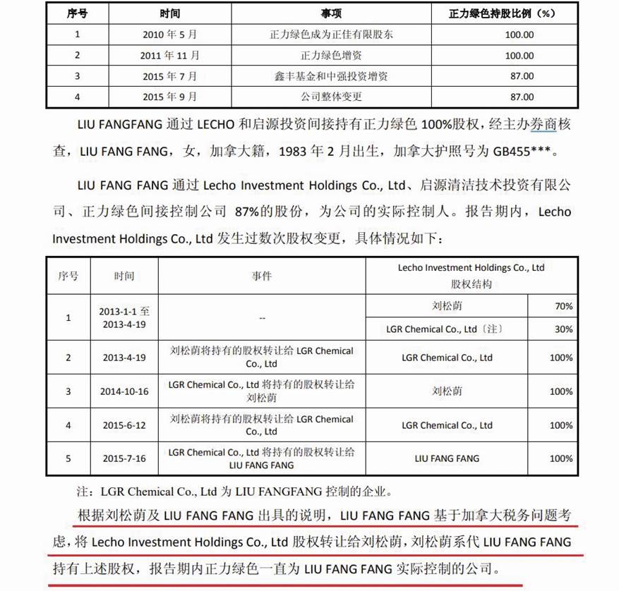 正佳環(huán)保公開轉(zhuǎn)讓說明書也提及劉松蔭代劉方方持股其他企業(yè):“根據(jù)劉松蔭及LIU FANG FANG出具的說明,LIU FANG FANG基于加拿大稅務(wù)問題考慮,將 Lecho Investment Holdings Co.,Ltd股權(quán)轉(zhuǎn)讓給劉松蔭,劉松蔭系代LIU FANG FANG持有上述股權(quán),報告期內(nèi)正力綠色一直為LIU FANG FANG實際控制的公司。”(見圖二)