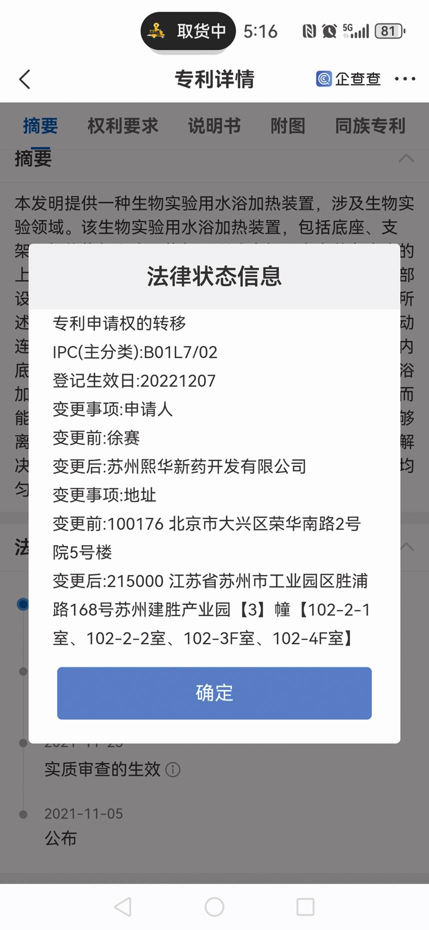 另一項(xiàng)招股書所稱由蘇州熙華原始取得的發(fā)明專利,“一種生物實(shí)驗(yàn)用水浴加熱裝置”同樣在授權(quán)前夕發(fā)生了申請(qǐng)人及專利權(quán)人的轉(zhuǎn)移,2022年12月22日,申請(qǐng)人由徐賽變更為蘇州熙華,通訊地址由北京市大興區(qū)榮華南路2號(hào)院5號(hào)樓變更為江蘇省蘇州市工業(yè)園區(qū)勝浦路168號(hào)蘇州建勝產(chǎn)業(yè)園3幢,102-2-1室、102-2-2室、102-3F室、102-4F室(見圖二)。