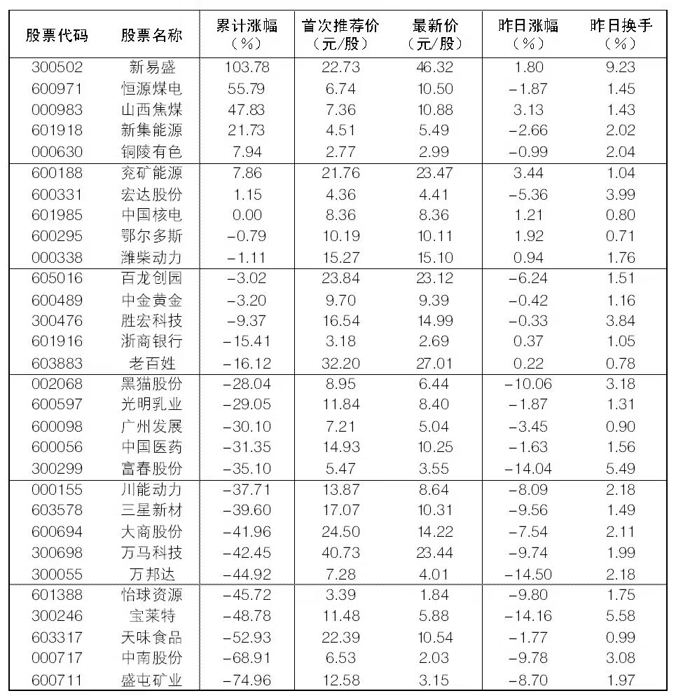 30成份股6日漲幅前五位的是新易盛、勝宏科技、老百姓、百龍創園、盛屯礦業,漲幅分別為11.83%、10.54%、10%、9.95%、9.60%;跌幅方面,山西焦煤、萬馬科技、兗礦能源、寶萊特跌幅居前。