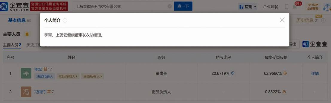 企查查顯示,泰錕醫藥實際控制人、董事長為季軍,其直接持股比例為20.6719%,最終受益股份為62.9666%。季軍簡介為“上藥云健康董事長&總經理”(見圖三)。