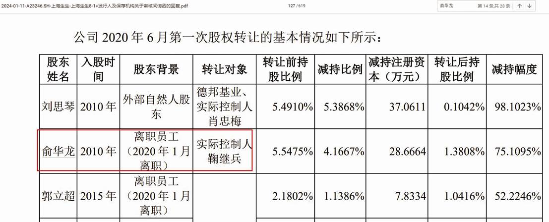 圖四:上海生生關于審核問詢函回復中稱俞華龍2020年1月離職截圖