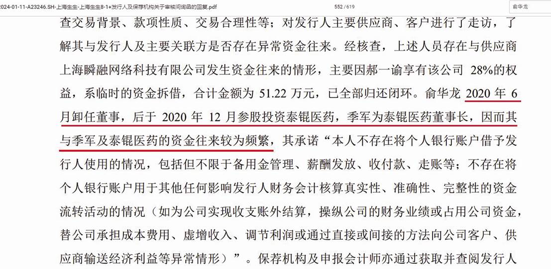 上海生生表示:“俞華龍自公司離職后曾擔任公司客戶泰錕醫藥主管業務的副總裁及董事,俞華龍已于2022年9月從泰錕醫藥離職,目前未參加其他工作。”公司還解釋稱,俞華龍2020年6月卸任董事,后于2020年12月參股投資泰錕醫藥,季軍為泰錕醫藥董事長,因而其與季軍及泰錕醫藥的資金往來較為頻繁。