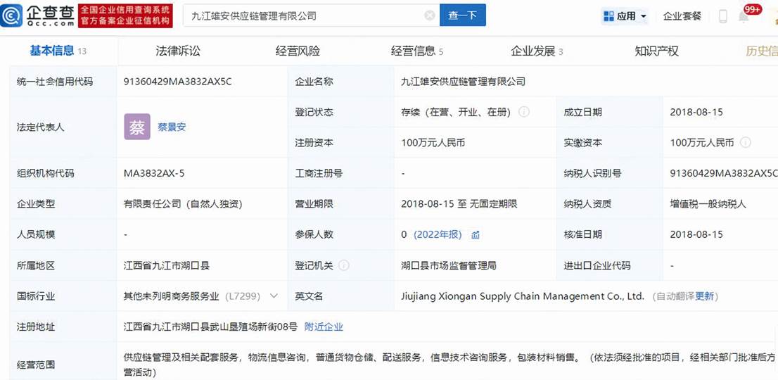 通過企查查查詢的該企業向當地市場監督機構提交的最新企業年報顯示,九江雄安供應鏈管理有限公司參保人數為0人。該企業成立于2018年8月,注冊資本100萬元人民幣,經營范圍為供應鏈管理及相關配套服務,物流信息咨詢,普通貨物倉儲、配送服務,信息技術咨詢服務,包裝材料銷售。(見圖三)