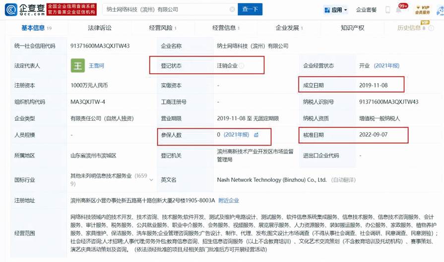 企查查顯示,納士網絡科技(濱州)有限公司成立于2019年11月,注冊資本為1000萬元,經營范圍為網絡科技領域內的技術開發、技術咨詢、技術服務;軟件開發、測試及維護;電路設計、測試服務、軟件信息系統集成服務、信息技術服務、信息技術咨詢服務、會計服務、審計服務、稅務服務、公共就業服務、職業中介服務、會務服務、視頻服務、展覽展示服務、人力資源服務、裝卸搬運服務、辦公服務、家政服務、植物養護服務、家具維護、保潔服務、洗車服務;企業管理咨詢服務等。