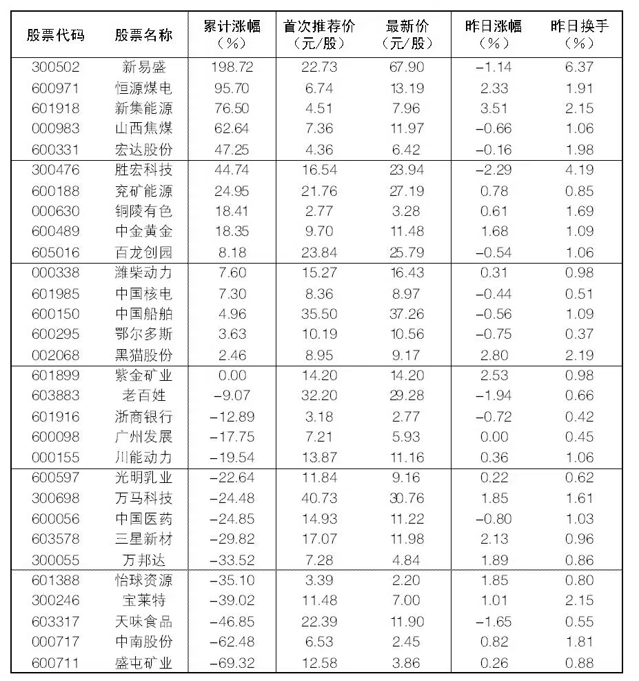 30成份股6日漲幅前五位的是新集能源、黑貓股份、恒源煤電、三星新材、萬邦達,漲幅分別為3.51%、2.80%、2.33%、2.13%、1.89%;跌幅方面,勝宏科技、老百姓、天味食品、新易盛跌幅居前。
