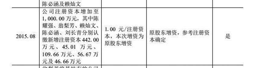 有意思的是,充滿資金壓力,持股六年多分文未賺的賴燦文和翁梨芳,在公司不久后的一次增資中,又“搶著認(rèn)購”增資款——2015年8月,公司注冊資本增加至1000萬元,其中陳耀強(qiáng)、翁梨芳、賴燦文、陳必涵、劉長青分別認(rèn)繳新增注冊資本442.00萬元、45.01萬元、109.66萬元、56.67萬元及46.66萬元,增資為1元/注冊資本(見圖一)。