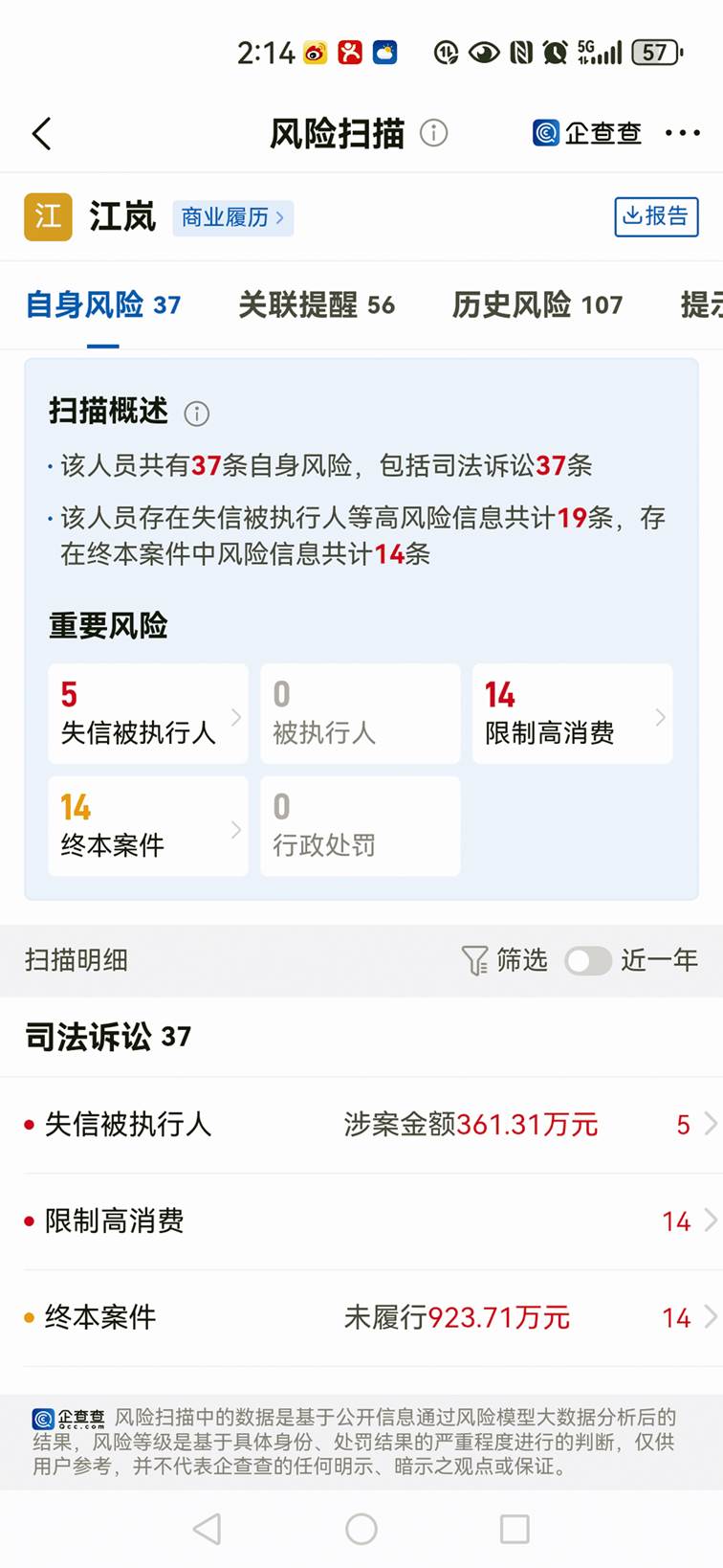 而作為公司創(chuàng)始股東之一的江嵐,目前是失信被執(zhí)行人狀態(tài),同時為被限高人群。企查查顯示,江嵐的關(guān)聯(lián)風(fēng)險高達(dá)37項,其中,作為失信被執(zhí)行人涉案金額為361.31萬元,作為經(jīng)營者的終本案件未履行金額為923.71萬元(見圖四)。
