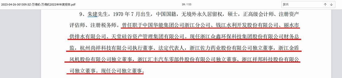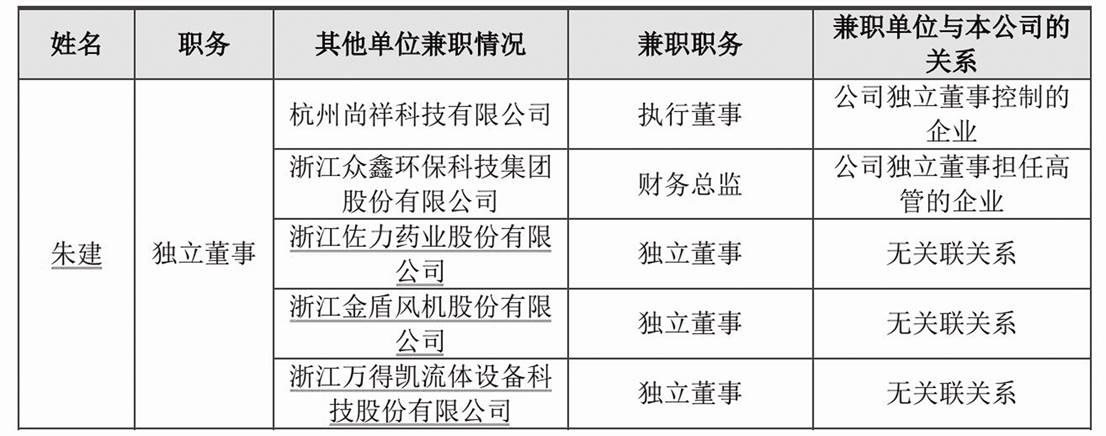 祥邦科技招股書披露:“朱建先生,1970年7月出生,中國國籍,無境外永久居留權,工商管理專業碩士研究生學歷、正高級會計師、注冊資產評估師、注冊稅務師。1991年8月至1994年4月,任杭州藍孔雀化學纖維有限公司主辦會計;1994年4月至1996年7月,任浙江錢江會計師事務所項目經理;1996年8月至2002年11月,任中國華能浙江公司、中國華能集團公司浙江分公司會計主管;2002年12月至2020年9月,任錢江水利開發股份有限公司財務總監兼董事會秘書;2021年11月至今,任浙江眾鑫環保科技集團股份有限公司財務總監;2021年1月至今,擔任浙江佐力藥業股份有限公司獨立董事;2021年6月至今,擔任浙江金盾風機股份有限公司獨立董事;2022年12月至今,擔任浙江萬得凱流體設備科技股份有限公司獨立董事;2022年8月至今,任公司獨立董事,其擔任公司獨立董事的任期為2023年2月至2026年2月。”