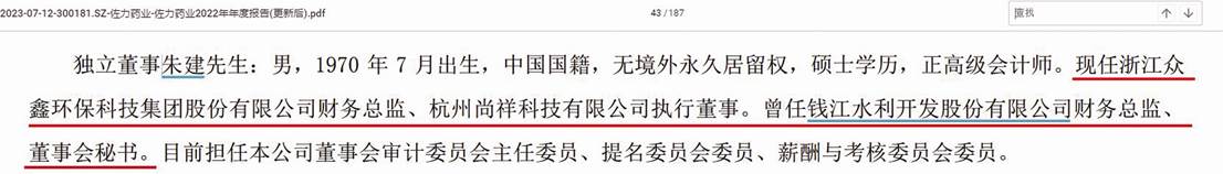 佐力藥業2022年年報披露獨董朱建任職情況為:“現任浙江眾鑫環保科技集團股份有限公司財務總監、杭州尚祥科技有限公司執行董事。曾任錢江水利開發股份有限公司財務總監、董事會秘書。目前擔任本公司董事會審計委員會主任委員、提名委員會委員、薪酬與考核委員會委員。”(見圖三)