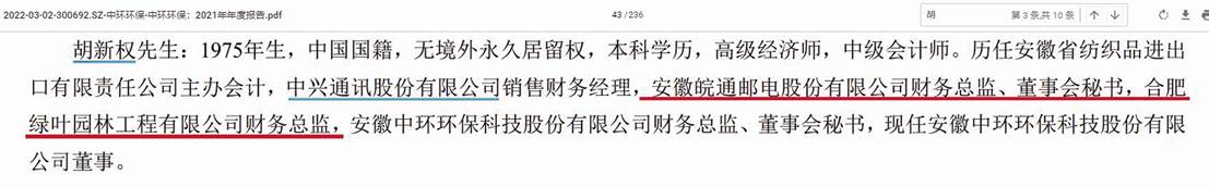 招股書披露董事、財務總監、董秘胡新權簡歷為:“1975年9月出生,中國國籍,無境外永久居留權,會計學專業本科學歷。1998年11月至2012年10月,任中興通訊股份有限公司銷售財務經理、區域財務總監、控股子公司財務總監及董事會秘書;2012年11月至2013年4月,任合肥綠葉園林工程有限公司財務總監;2013年5月至2021年12月,任安徽中環環保科技股份有限公司董事、財務總監、董事會秘書。2022年1月起在公司任職,現任公司董事、財務總監、董事會秘書,其擔任公司董事的任期為2023年2月至2026年2月。”