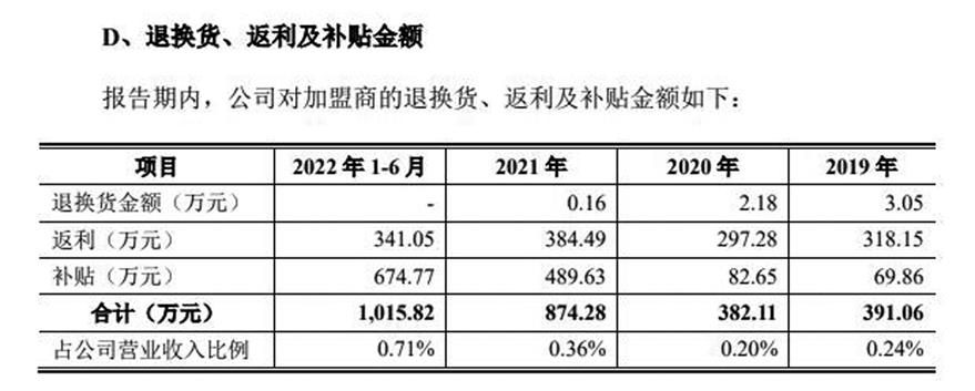 還有品牌茶業務以經銷模式為主的中國茶葉,招股書中對經銷商的披露更詳盡,經銷商管理方面甚至對運費、返利、補貼和退換貨具體政策或金額都有披露,譬如披露了報告期對加盟商的退換貨、返利及補貼金額(見圖二)。對于經銷商數量、銷售額,中國茶葉不僅分別對不同層級、類別經銷商報告期內的數量、銷售額進行了披露,還就個人經銷商、加盟店情況進行了專門披露,譬如加盟店除了數量、銷售額還披露了毛利率。