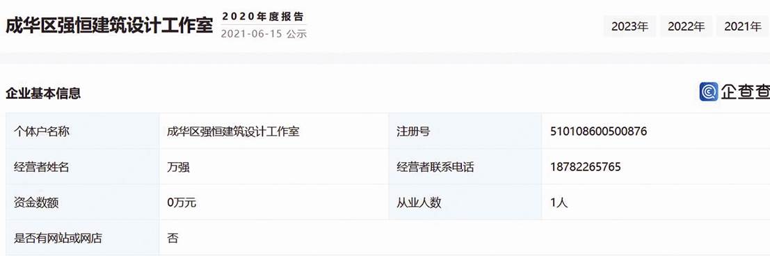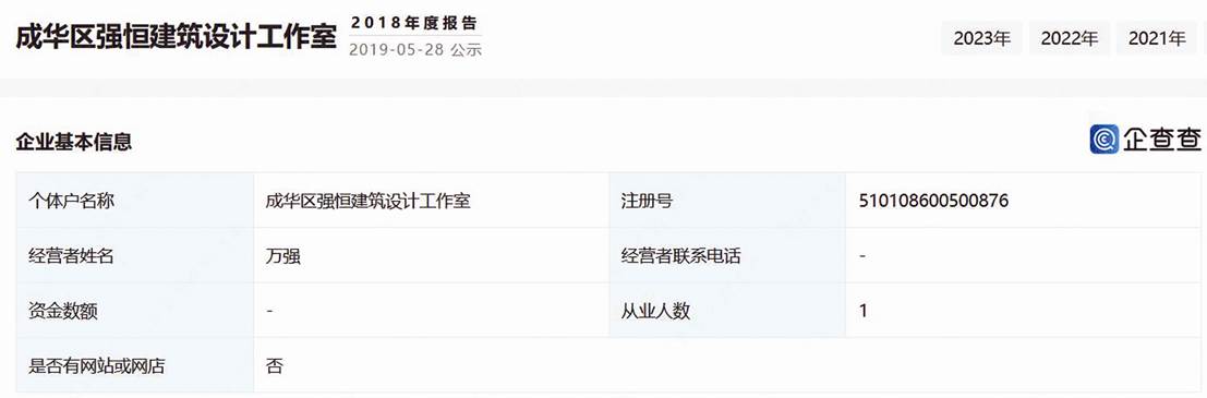 通過企查查查詢的工商信息顯示,成華區強恒建筑設計工作室成立于2014年3月17日,為個體工商戶,經營者為萬強,所屬行業為商務服務業,經營范圍包含建筑平面設計服務。企查查進一步顯示,該工作室資質證書為0,顯示的客戶僅有洲宇設計一家;其2018年、2020年年報顯示,從業人數僅1人(見圖三、四)。