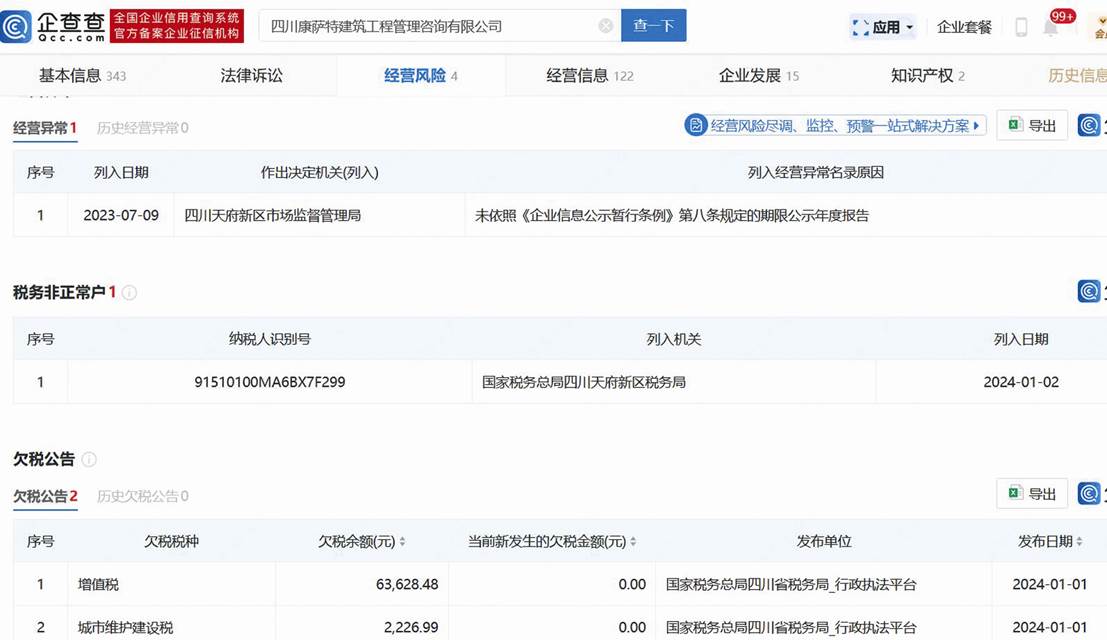 引人關注的是,四川康薩特建筑工程管理咨詢有限公司經營異常且欠稅(見圖五)。2023年7月,因未依照《企業信息公示暫行條例》第八條規定的期限公示年度報告,該企業被四川天府新區市場監督管理局列入經營異常。國家稅務總局四川省稅務局2024年1月發布的信息顯示,該企業欠稅逾6萬元。