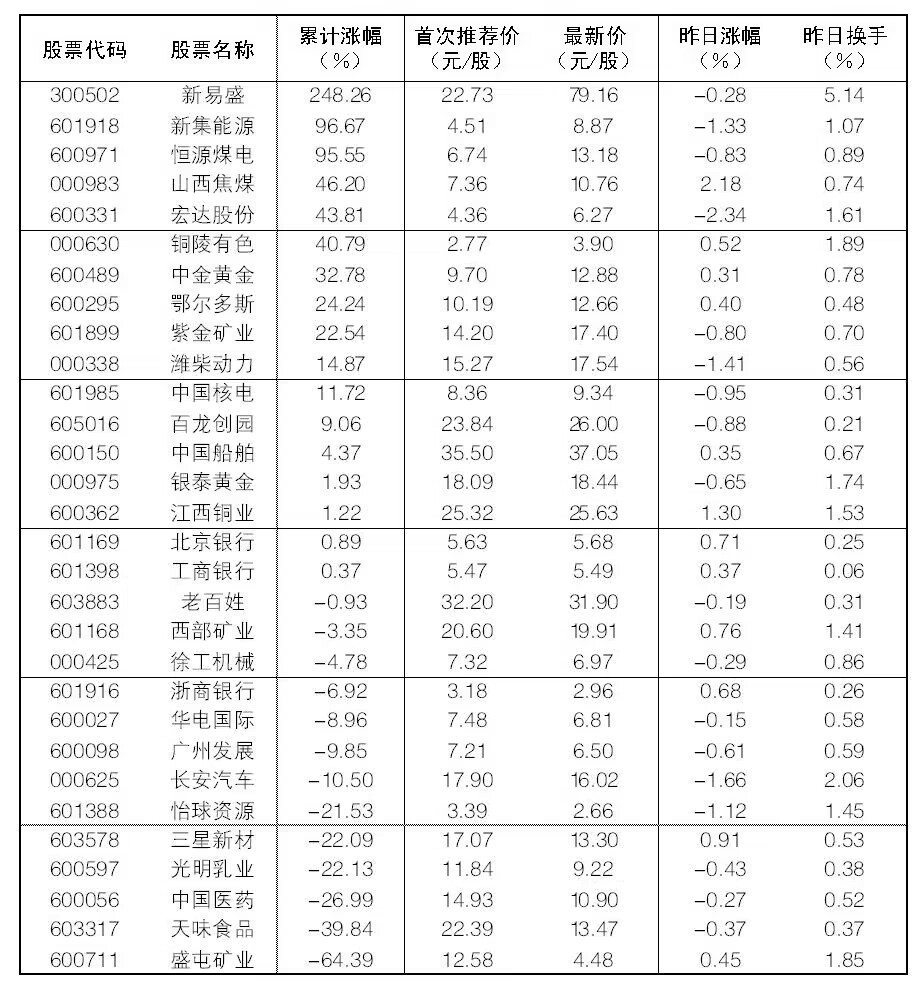 30成份股25日漲幅前五位的是山西焦煤、江西銅業(yè)、三星新材、西部礦業(yè)、北京銀行,漲幅分別為2.18%、1.30%、0.91%、0.76%、0.71%;跌幅方面,宏達股份、長安汽車、濰柴動力、新集能源跌幅居前。