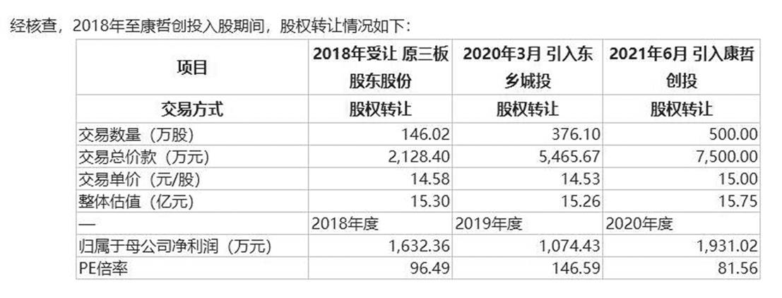 同時,施美藥業介紹了2018年至康哲創投入股期間的股權轉讓價格、估值、PE等情況,例如2018年江鴻受讓原新三板股東股份價格為14.58元/股、2020年3月引入外部新股東價格為14.53元/股,再如這兩次股權轉讓的PE分別為96.49倍、146.59倍,康哲創投入股時PE為81.56倍(見圖一)。