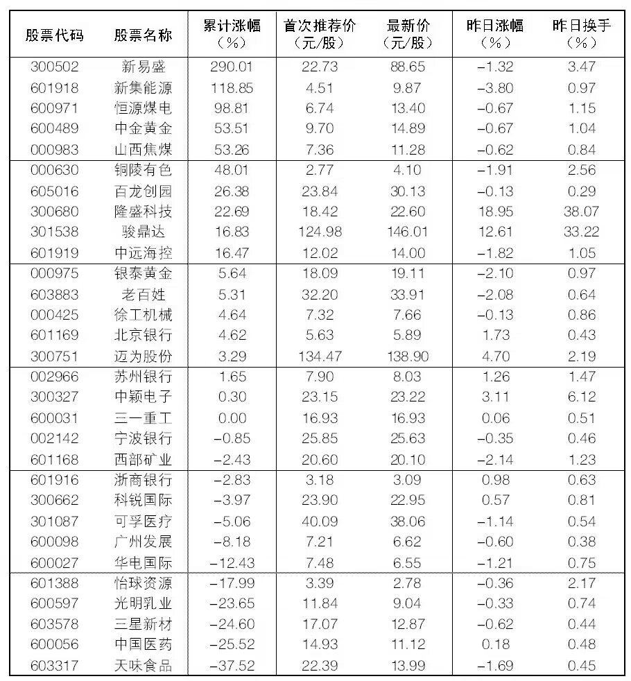 30成份股22日漲幅前五位的是隆盛科技、駿鼎達、邁為股份、中穎電子、北京銀行,漲幅分別為18.95%、12.61%、4.70%、3.11%、1.73%;跌幅方面,新集能源、西部礦業、銀泰黃金、老百姓跌幅居前。