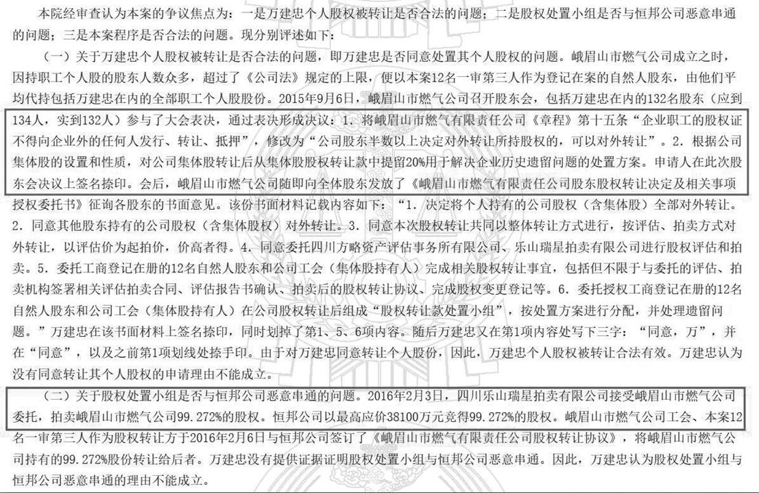 據《裁定書》,峨眉燃氣成立之時,因持職工個人股的股東人數眾多,超過了《公司法》規定的上限,便以本案12名一審第三人作為登記在案的自然人股東,由他們平均代持包括萬建忠在內的全部職工個人股股份。2015年9月6日,峨眉燃氣召開股東會,包括萬建忠在內的132名股東(應到134人,實到132人)參與了大會表決,通過表決形成決議:“1.將峨眉山市燃氣有限責任公司《章程》第十五條‘企業職工的股權證不得向企業外的任何人發行、轉讓、抵押’,修改為‘公司股東半數以上決定對外轉讓所持股權的,可以對外轉讓’。2.根據公司集體股的設置和性質,對公司集體股轉讓后從集體股股權轉讓款中提留20%用于解決企業歷史遺留問題的處置方案(見圖三)。”申請人在此次股東會決議上簽名捺印。會后,峨眉燃氣隨即向全體股東發放了《峨眉山市燃氣有限責任公司股東股權轉讓決定及相關事項授權委托書》征詢各股東的書面意見。