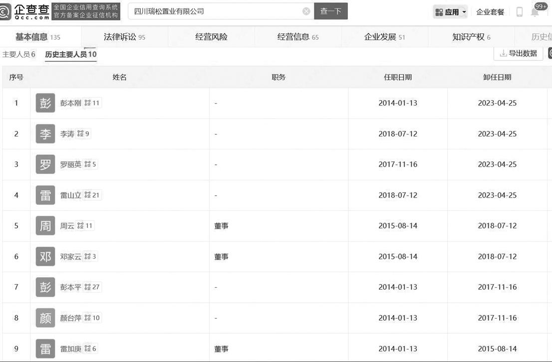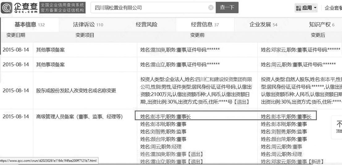 通過企查查查詢的工商登記信息顯示,2015年,四川瑞松置業有限公司股東、董事長為彭本平;彭本剛擔任董事,直至2023年才卸任(見圖四、五)。