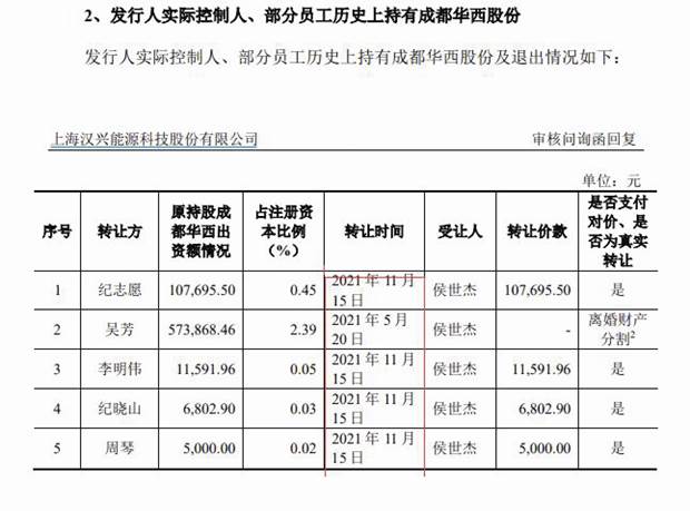 公司對(duì)問詢函的回復(fù)顯示:“2003年10月9日,成都華西、紀(jì)志愿、廖啟芳、侯世杰作出股東會(huì)決議,同意成立上海漢興(成立時(shí)原名“上海華西”),約定公司注冊(cè)資本為300萬元,并通過公司章程。”彼時(shí),成都華西持有上海漢興90%的股權(quán),紀(jì)志愿、廖啟芳、侯世杰分別持有3.33%的股權(quán)。