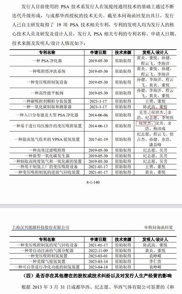 漢興能源強(qiáng)調(diào):“目前使用的PSA技術(shù)系發(fā)行人在氫提純通用技術(shù)的基礎(chǔ)上通過不斷迭代升級(jí)形成,與成都華西授權(quán)的技術(shù)無關(guān)。截至本問詢函回復(fù)出具日,發(fā)行人已自主研發(fā)取得了19項(xiàng)PSA技術(shù)相關(guān)專利,專利的發(fā)明人均為發(fā)行人的核心技術(shù)人員、研發(fā)及設(shè)計(jì)人員。”