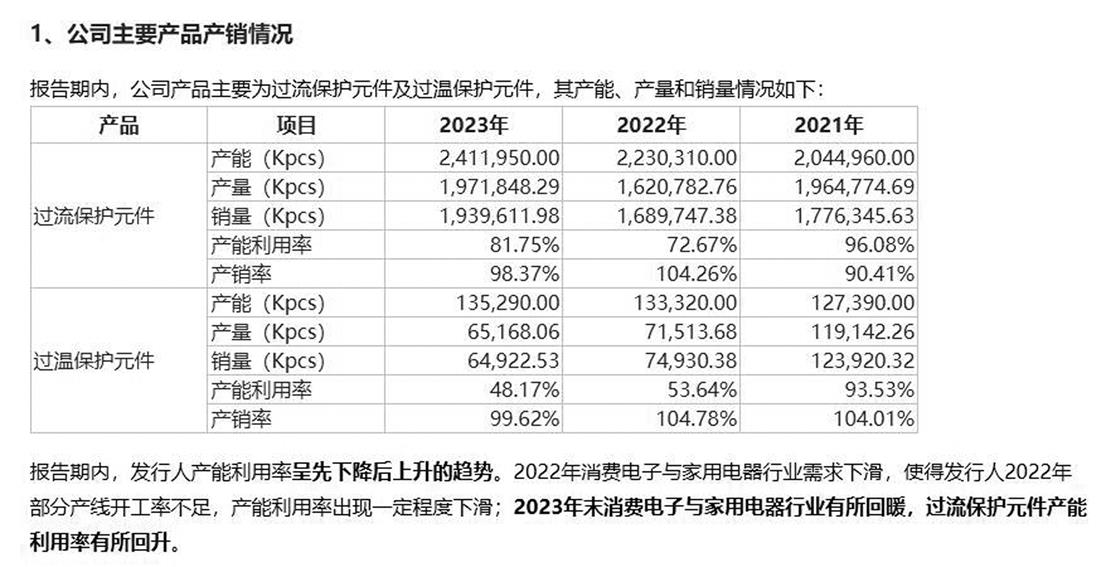 與業績穩定增長不同,公司期內產能利用率出現了波動,公司對主要產品產銷情況在招股書中如是稱:“發行人產能利用率呈先下降后上升的趨勢。2022年消費電子與家用電器行業需求下滑,使得發行人2022年部分產線開工率不足,產能利用率出現一定程度下滑;2023年末消費電子與家用電器行業有所回暖,過流保護元件產能利用率有所回升。”
