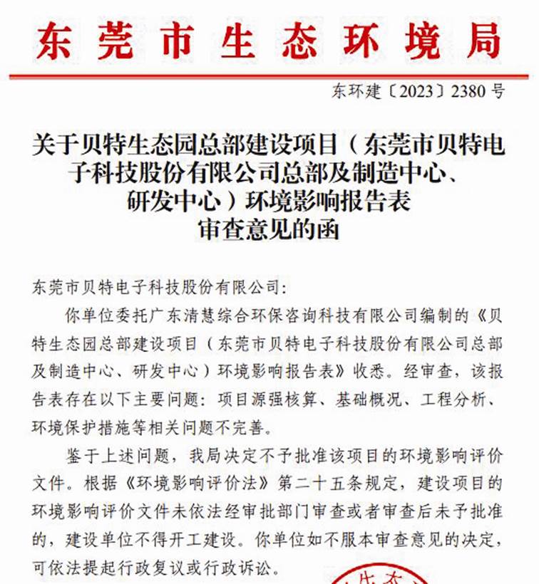 “經審查,該報告表存在以下主要問題:項目源強核算、基礎概況、工程分析、環境保護措施等相關問題不完善。鑒于上述問題,我局決定不予批準該項目的環境影響評價文件。根據《環境影響評價法》第二十五條規定,建設項目的環境影響評價文件未依法經審批部門審查或者審查后未予批準的,建設單位不得開工建設。你單位如不服本審查意見的決定,可依法提起行政復議或行政訴訟。”《關于貝特生態園總部建設項目(東莞市貝特電子科技股份有限公司總部及制造中心、研發中心)環境影響報告表審查意見的函》如是稱。