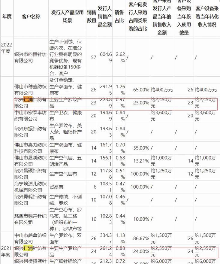 佰源裝備在回復北交所第三輪問詢時,對與公司合作的小規模客戶披露顯示,紹興仁浦成立于2015年,2020年成為公司客戶。2021年,公司向紹興仁浦銷售24臺機器,銷售金額為261.24萬元,2021年紹興仁浦向公司采購在其同類采購占比為24%,當年紹興仁浦通過上述采購后相關生產實現銷售收入約為2550萬元;2022年,公司又向紹興仁浦銷售23臺機器,銷售金額為223.89萬元,2022年紹興仁浦向公司采購占同類采購的占比為23%,當年紹興仁浦通過上述采購后相關生產實現銷售收入為2450萬元。