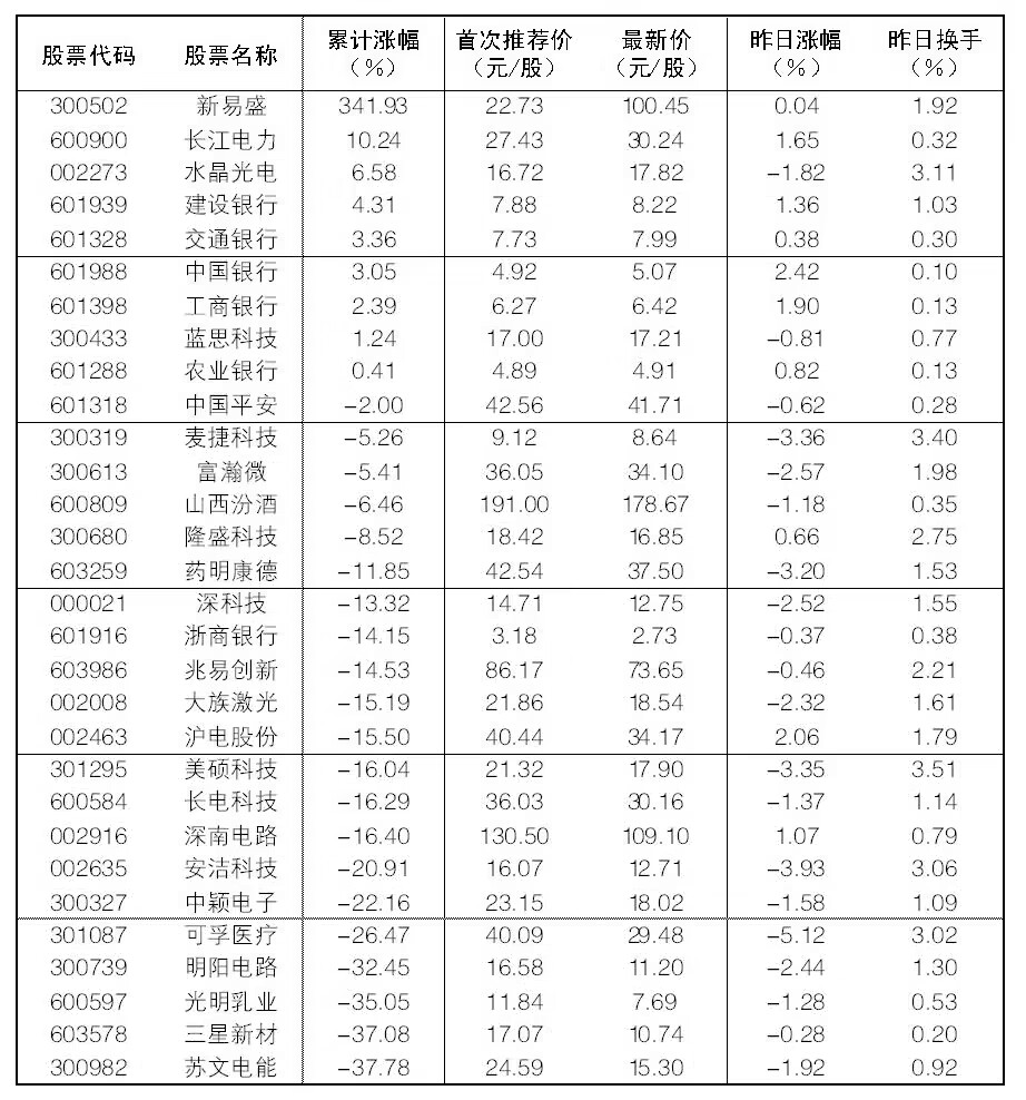 30成份股22日漲幅前五位的是中國銀行、滬電股份、工商銀行、長江電力、建設銀行,漲幅分別為2.42%、2.06%、1.90%、1.65%、1.36%;跌幅方面,可孚醫療、安潔科技、麥捷科技、美碩科技跌幅居前。