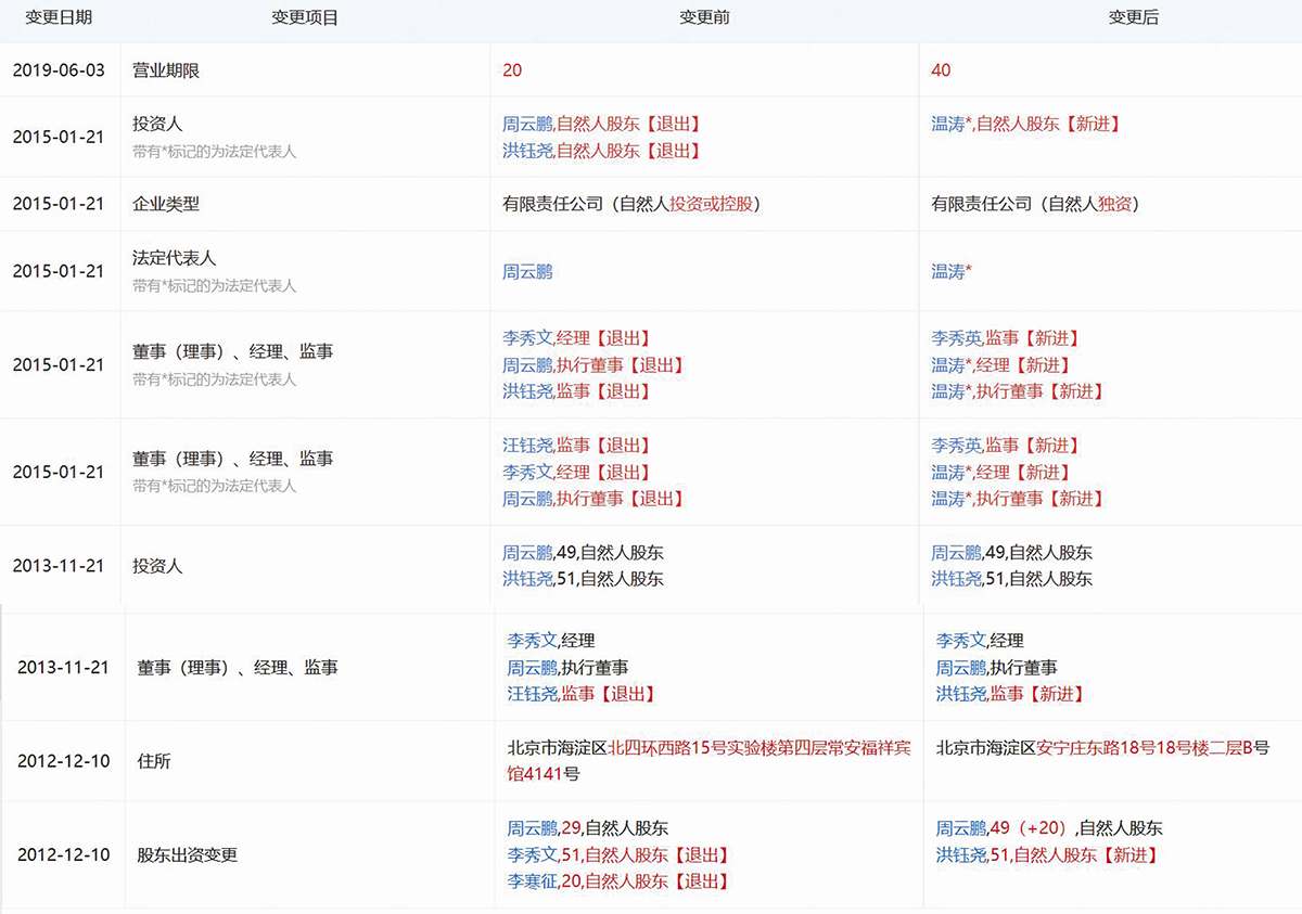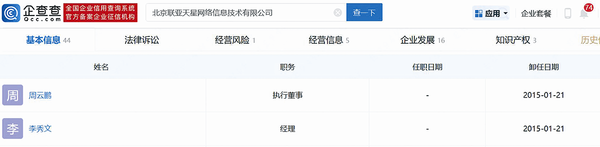 通過企查查查詢到的工商登記信息顯示,周云鵬長期擔任北京聯亞天星網絡信息技術有限公司執行董事并持股,直到2015年1月才退出,而在卸任前,其還長期為該企業法定代表人,并在2010年、2012年增加持股(圖一、二)。