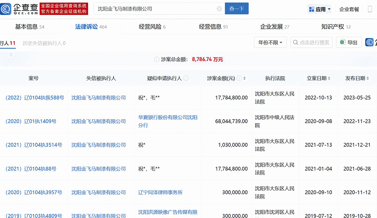 圖四:沈陽金飛馬制漆有限公司被列為失信被執行人