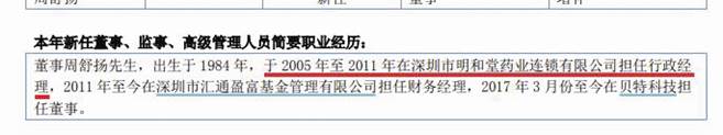 公司2017年年報(bào)披露的周舒揚(yáng)簡(jiǎn)歷(見圖一)為:“董事周舒揚(yáng)先生,出生于1984年,于2005年至2011年在深圳市明和堂藥業(yè)連鎖有限公司擔(dān)任行政經(jīng)理,2011年至今在深圳市匯通盈富基金管理有限公司擔(dān)任財(cái)務(wù)經(jīng)理,2017年3月份至今在貝特科技擔(dān)任董事?!?/p>