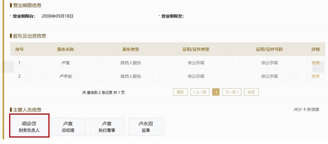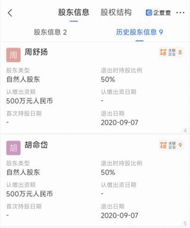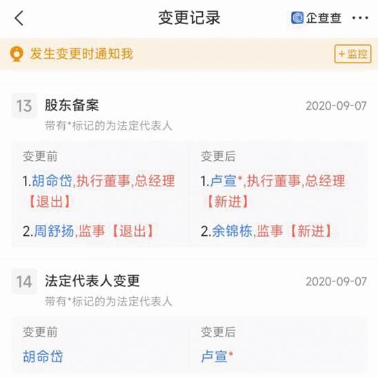 但是,通過(guò)國(guó)家企信平臺(tái)及企查查查詢到的工商信息顯示,胡命岱目前還在2008年9月成立的創(chuàng)夢(mèng)空間(惠州)科技有限公司擔(dān)任財(cái)務(wù)負(fù)責(zé)人(見圖二)。該企業(yè)變更登記信息還顯示,胡命岱2020年9月7日不再擔(dān)任執(zhí)行董事、總經(jīng)理以及不再持股50%,公司董事周舒揚(yáng)與之同時(shí)不再登記為持股50%股東并卸任監(jiān)事(見圖三、圖四)。