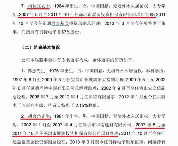 貝特電子掛牌新三板前的公開轉(zhuǎn)讓說(shuō)明書披露,董事楊佳宜系匯通盈富執(zhí)行事務(wù)合伙人委派代表,其簡(jiǎn)歷為(見圖五):“1984年出生,女,中國(guó)國(guó)籍,無(wú)境外永久居留權(quán),大專學(xué)歷。2007年5月至2011年10月任深圳市展源投資擔(dān)保有限公司項(xiàng)目經(jīng)理;2011年10月至今任匯通盈富基金投資部副總經(jīng)理;2013年3月至今任貝特電子董事,間接持有貝特電子0.67%股份?!?/p>