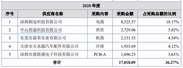 其中,2020年,公司的前五大供應商分別為深圳朝冠科技有限公司、中山偉強科技有限公司、東莞市霖榮實業有限公司、天津市天水源汽車配件有限公司、深圳市惠聯盛電子科技有限公司,公司分別向其采購8525.57萬元、2729.06萬元、2131.53萬元、1935.69萬元、1696.23萬元,占采購金額的比例分別為18.17%、5.82%、4.54%、4.12%、36.27%。