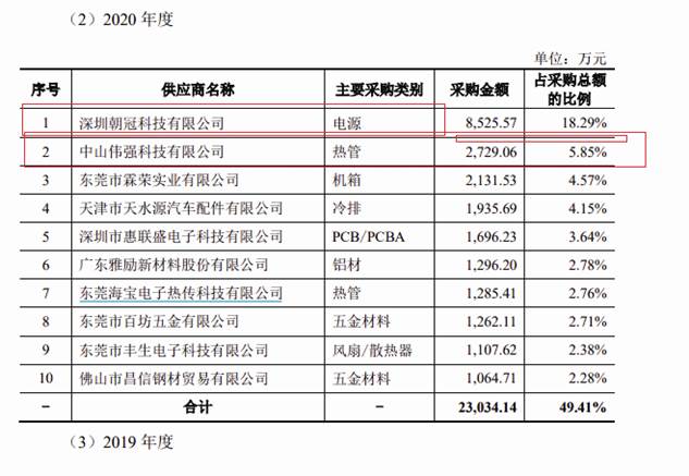 值得一提的是,在上述五大主要供應商中,東莞市霖榮實業有限公司成立于2016年,成立不久即成為公司的主要供應商,且其在2018年至2020年均為公司前十大供應商。