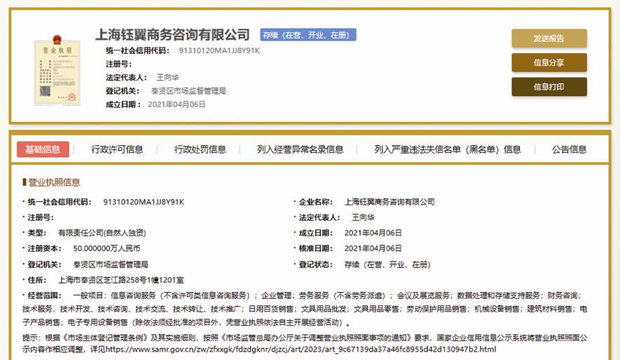 通過國家企信平臺和企查查查詢到的工商信息顯示,已不在公司兼職的間接股東王向華于2021年獨資設立了上海鈺翼商務咨詢有限公司,并擔任法定代表人、執行董事(見圖一),該企業2022年向當地市場監督機構提交的企業年報中,企業聯系電話為13472780289。