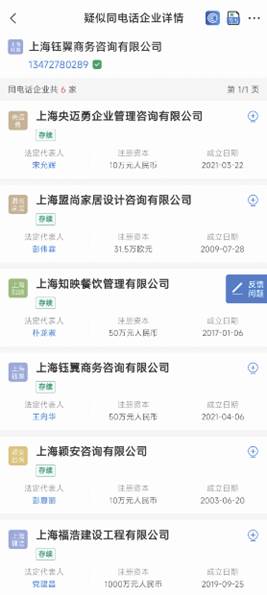 事實上,年報中使用手機號13472780289作為聯系電話的企業還有上海央邁勇企業管理咨詢有限公司(2022年年報)、上海盟尚家居設計咨詢有限公司(2022年年報)、上海福浩建設工程有限公司(2022年年報)等企業(見圖二)。這些企業與上海穎安咨詢有限公司一樣,從工商信息顯示的股東、主要人員來看,與王向華獨資的上海鈺翼商務咨詢有限公司并沒有重疊之處。