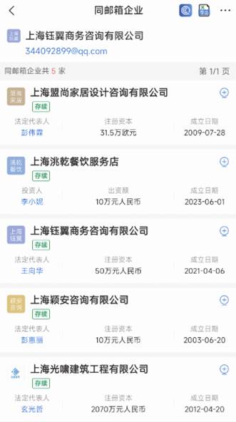 此外,除了上海穎安咨詢有限公司,上海盟尚家居設計咨詢有限公司、上海光嘯建筑工程有限公司,以及上海洮乾餐飲服務店等3家企業在年報中也使用過上海鈺翼商務咨詢有限公司2022年年報的登記郵箱344092899@qq.com(見圖三)。