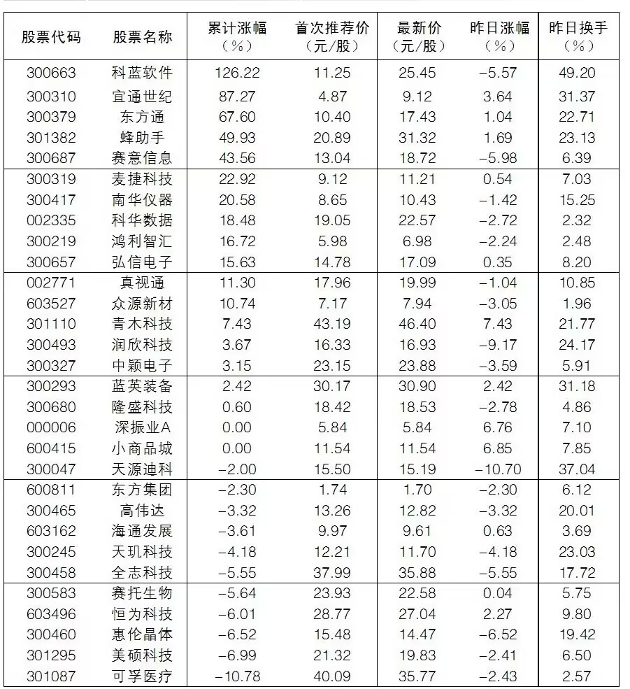 30成份股15日漲幅前五位的是青木科技、宜通世紀、藍英裝備、恒為科技、蜂助手,漲幅分別為7.43%、3.64%、2.42%、2.27%、1.69%;跌幅方面,天源迪科、潤欣科技、惠倫晶體跌幅居前。